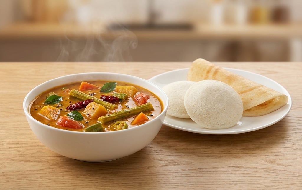 सांभर थोड़ी देर में गाढ़ा हो जाता है — पानी पहले से समायोजित करें।